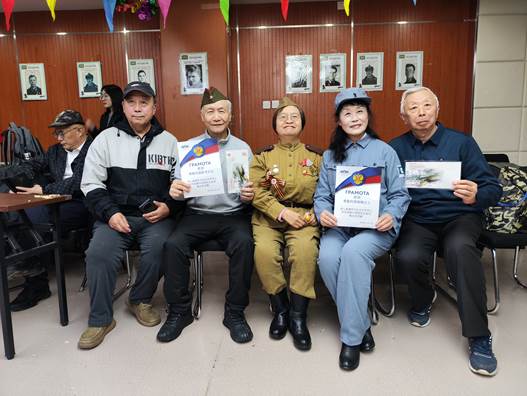 在苏联二战军歌《神圣的战争》的雄壮音乐旋律中,丽兰女士代表大使馆向“为纪念苏军烈士和巩固俄中两国友谊而做出贡献”的李英男、朱宏佑、黄江週等人颁发奖状证书。
