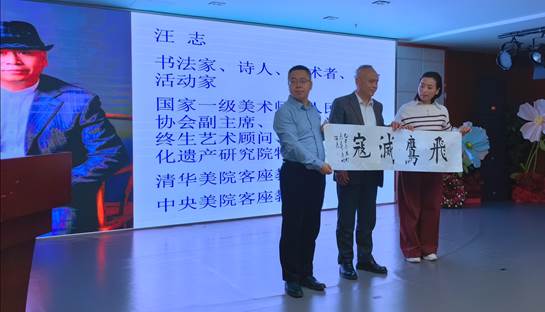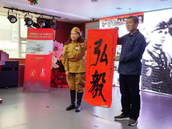 书法家朱俊国向主办方展示赠送作品:“飞鹰撼邪寇,铁血铸英魂”。