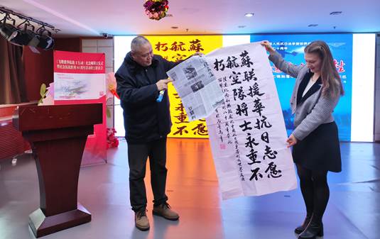 余滨特别介绍了原空军司令员刘亚楼上将的外事秘书兼翻译、军科研究员孙维韬精心编写出版《中苏美空军抗日空战记实》和《中国青年报》2006年专访孙维韬的“冰点”报道文章《被遗忘的牺牲》的情况。将孙维韬老人特意题写的“苏联援华抗日志愿航空队将士永垂不朽”书法,赠送给了大使馆代表丽兰女士。