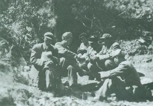 1951年11月,郑维山(左一)和李志民、杨得志、陈先瑞参加十九兵团在朝鲜前线防空洞口开常委会。