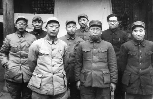 平津战役总前委指挥部合影。左起:黄克诚、谭政,、聂荣臻、肖华、刘亚楼、罗荣桓、高岗、林彪。