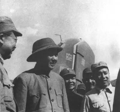 1945年10月11日,毛泽东参加重庆谈判后返回延安,谭政(右三)等到机场迎接。
