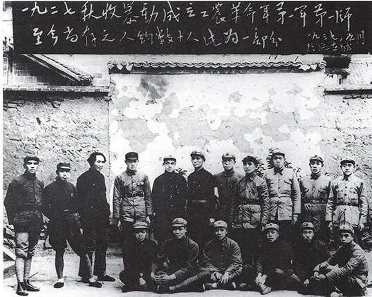 参加1927年秋收起义的部分人员于1937年在延安合影。后排左三为毛泽东、左七为罗荣桓、左八为谭政。