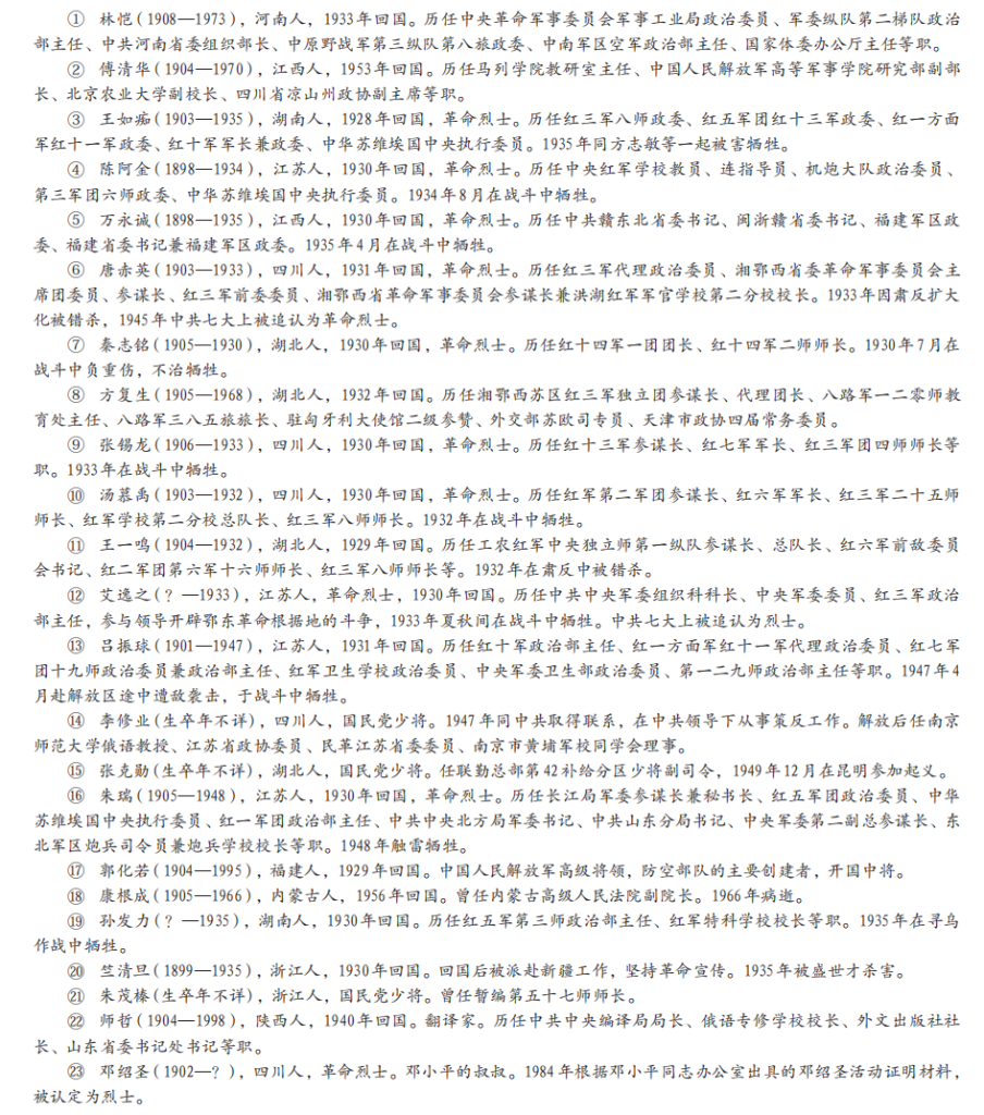 这些留苏的中国军事学员,许多人在归国后即成为各级红军的骨干力量,有的迅速成长为高级将领,有的则在军事教育方面建功立业。据笔者统计,曾在莫斯科步兵学校就读、任教员或翻译的有:黄河清(黄火青)、伍修权、庄振凤(庄田)、王智涛、田德修(吉合)、谢洪台(林恺)、傅清华、王浚欧(王如痴)、陈阿金、万永诚、唐赤英、秦超(秦志铭)、方复生、张锡龙、汤慕禹、王一鸣、艾逸之、吕振球、李修业、张克勋等,共计约140人。在莫斯科炮兵学校就读的有:朱瑞、郭化若、康根成、孙发力、竺清旦、朱茂榛等,共计约70人。在莫斯科军事工程学校就读的有:师西德(师哲)、邓绍圣、陈家齐、高煊等,共计约40人。在空军系统院校就读的有:常乾坤、王弼、唐铎、徐介藩、刘云、李乾元等10人。另有在列宁格勒军事通讯学校的涂作潮等4人,特维尔骑兵学校的马宗显等1人。