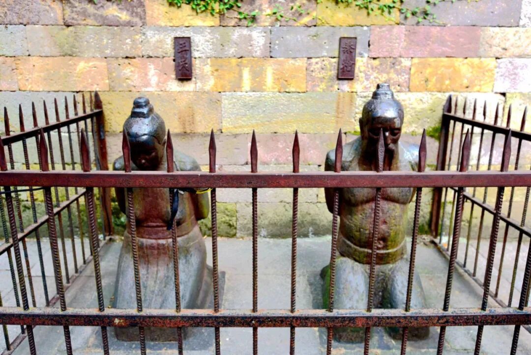 岳飞墓门的下边有四个铁铸的人像,反剪双手,面墓而跪,即陷害岳飞的秦桧、王氏、张俊、万俟卨四人。