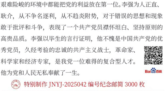 这是一位传奇人物,每一次的人生转轨都出乎意料,每一次的伟业功成都令人称赞。他是忠诚的战士,兵行险招,出奇制胜,看似隐子,实为匕首之刃。2025年10月15日,“延安根,科技魂”——纪念李强同志诞辰120周年追思会,在北京国宾酒店举行。老兵方阵·邮简发布平台特别策划推出《李强(曾培洪)同志诞辰120周年》纪念邮简(加长版),编号印制3000枚。