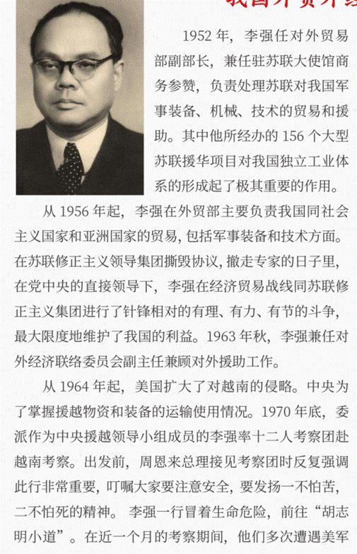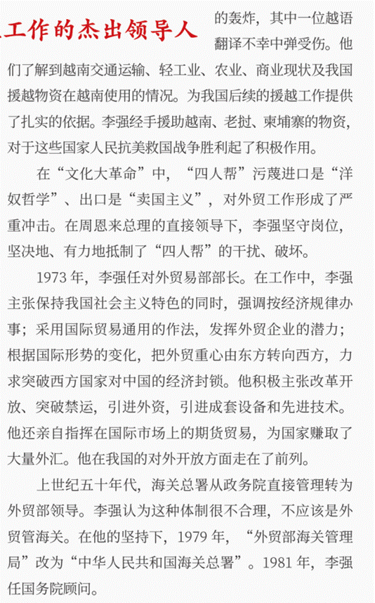 李强同志是久经考验的共产主义战士、无产阶级革命家、科学家和经济专家,是中国外经贸事业的先驱。————————