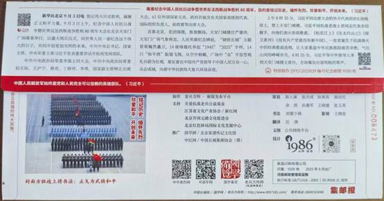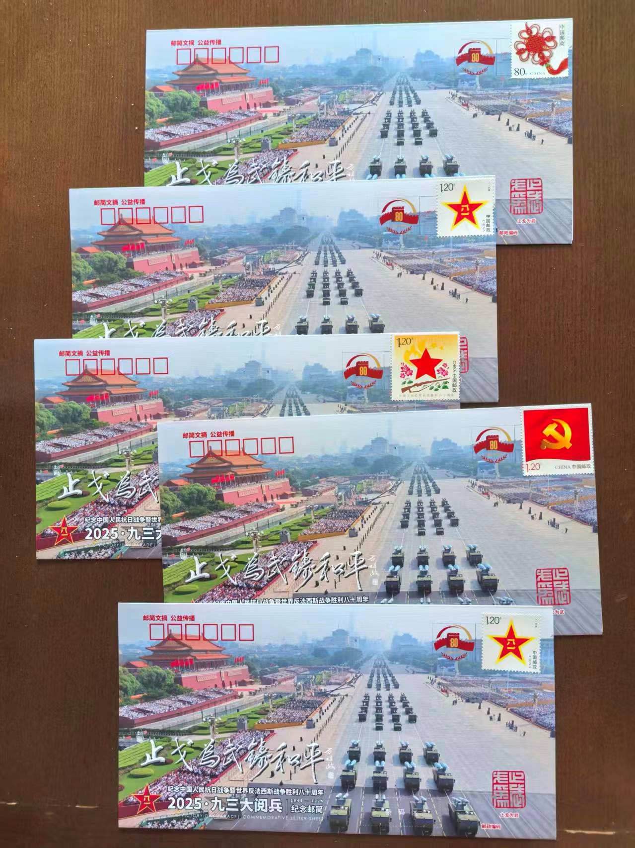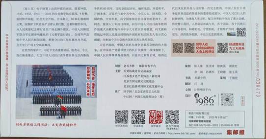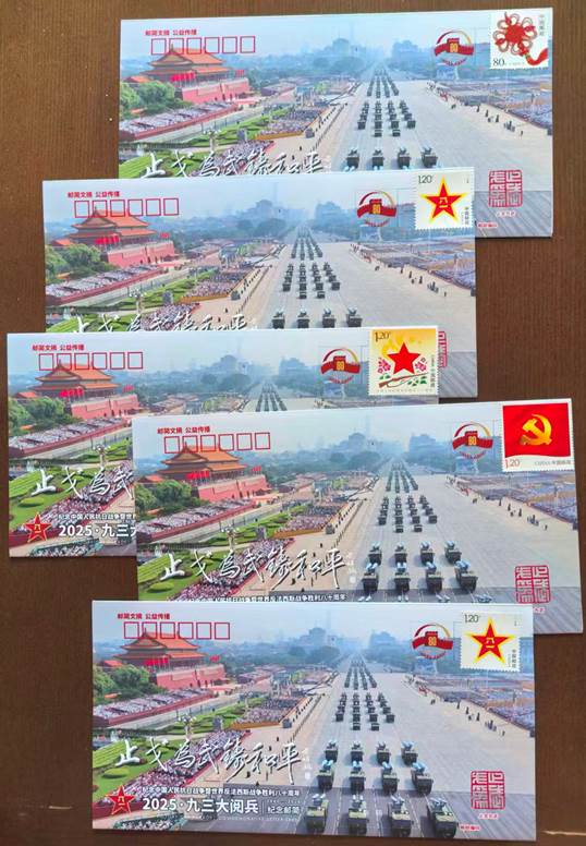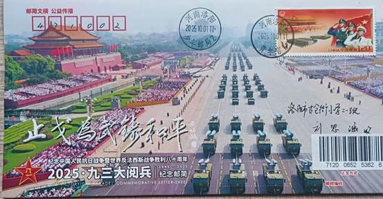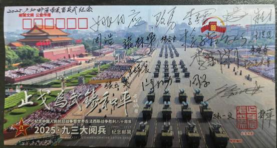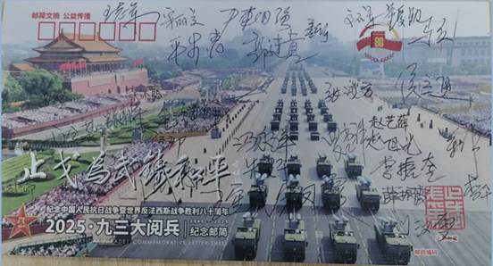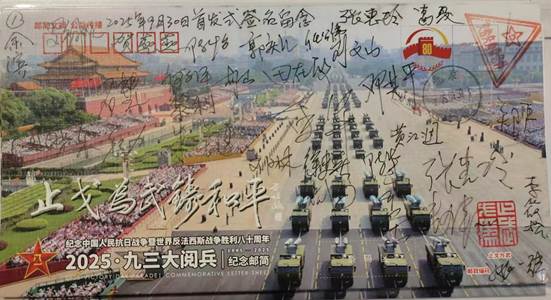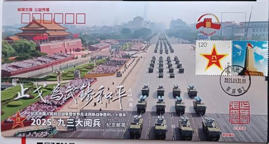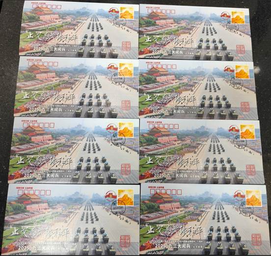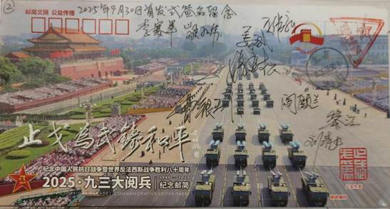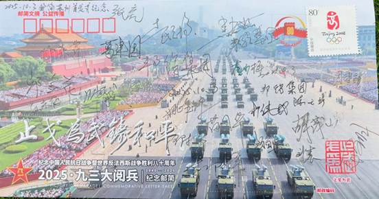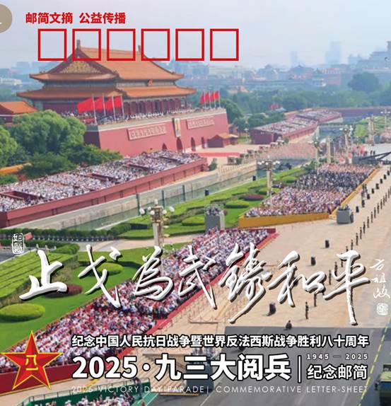 由众多抗战将领后代发起、老兵方阵·邮简发布平台策划设计的《2025·九三大阅兵》纪念邮简,共编号印制9300枚。9月30日国家烈士纪念日在北京、南京分别举行了纪念邮简首发式活动。之后10月1日国庆节在洛阳,3日在苏州,4日在成都也举行了别开生面的纪念邮简首发式。
