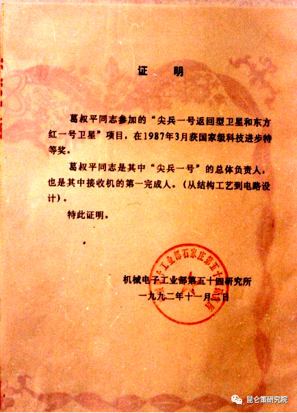 1987年全国科技大会上,作为“尖兵一号返回型卫星和东方红一号”项目获得了国家科技进步特等奖。父亲是“尖兵一号”的总体负责人和地面、卫星的发射,接收机的第一完成人。