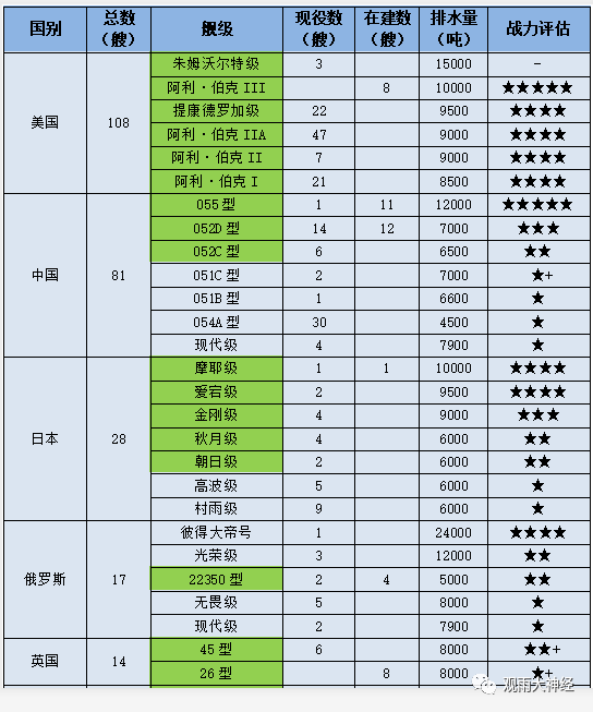 以下是TOP5国家主力水面战舰的数量和规模列表,其中盾舰(或装备类似宙斯盾系统的军舰)标涂绿色: