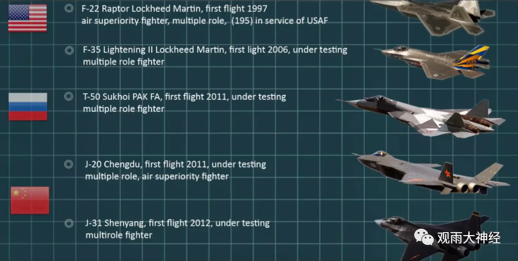 美国的F22,F35;俄罗斯的苏57;中国的J20,J31