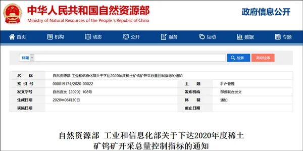 7月15日,工业和信息化部、自然资源部下达2020年度稀土开采、冶炼分离总量控制指标分别为140000吨、135000吨,较2019年相比增加约6%、6.3%。