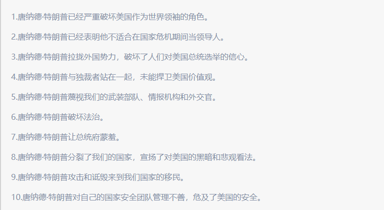 2、七十多位共和党高层人士联名上书痛斥特朗普十宗罪,并倒戈拜登。