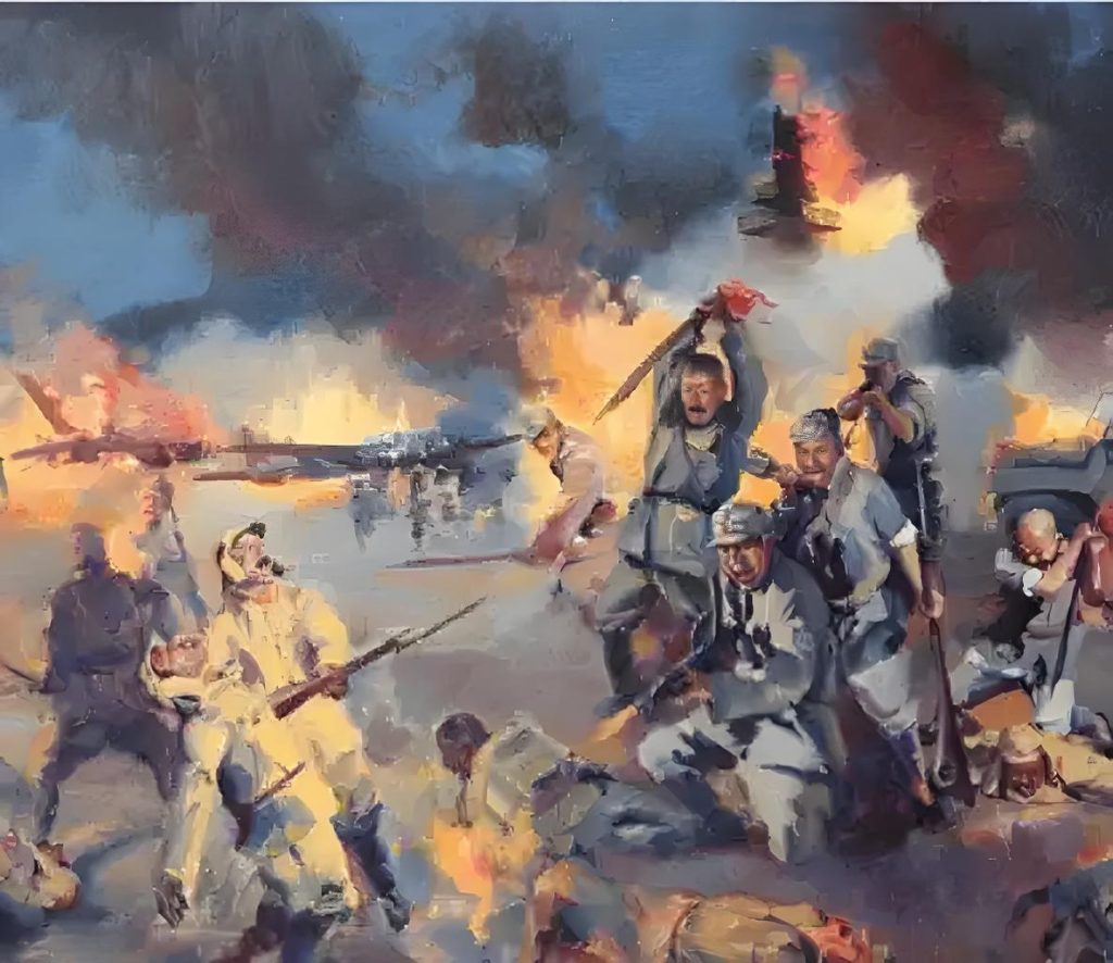 只见张凤鸣指导员手提二十响驳壳枪冲在战斗队伍最前面。