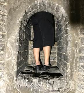 图:飞虹塔内二层供奉着三米多高铜铸坐佛,与台基座都是空心的,里面藏匿《金藏》。细看青砖的基座,砖色砖缝不齐,材质不一。非原装留下明显修补过痕迹,证实王万荣、李溪林、薛国范及力空“佛座藏经”回忆属实。排除杨泽生对经藏塔上和上不去人之质疑。