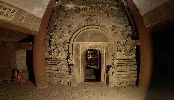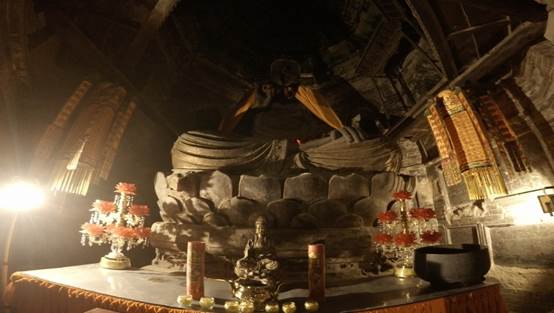 图:登上塔内二层来到厅门,内供奉着端庄肃穆三米多高的铜铸坐佛,立在青砖台基上,佛像和基座都是空心的,里面藏匿《金藏》,这是个绝妙极佳的藏经处。