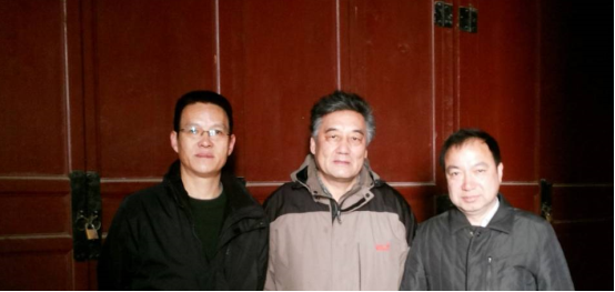 图:2014年2月与临汾党史办刘鹏举副主任(右)、李宇红科长(左)摄于广胜寺弥陀殿《赵城金藏》的原藏经櫃前。