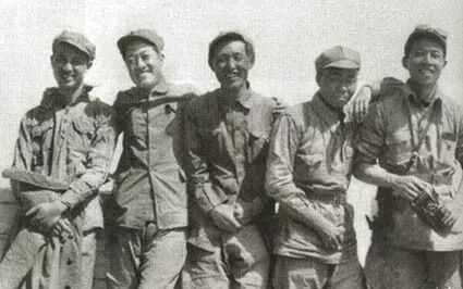 ▲陪同卡尔逊到华北考察的欧阳山尊(左起)、刘白羽、金肇野、林山、汪洋。