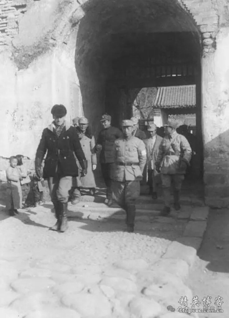 ▲聂荣臻(前排右1)、周立波(后排左1)陪同美国驻华武官卡尔逊走出阜平县政府到军区司令部。1938