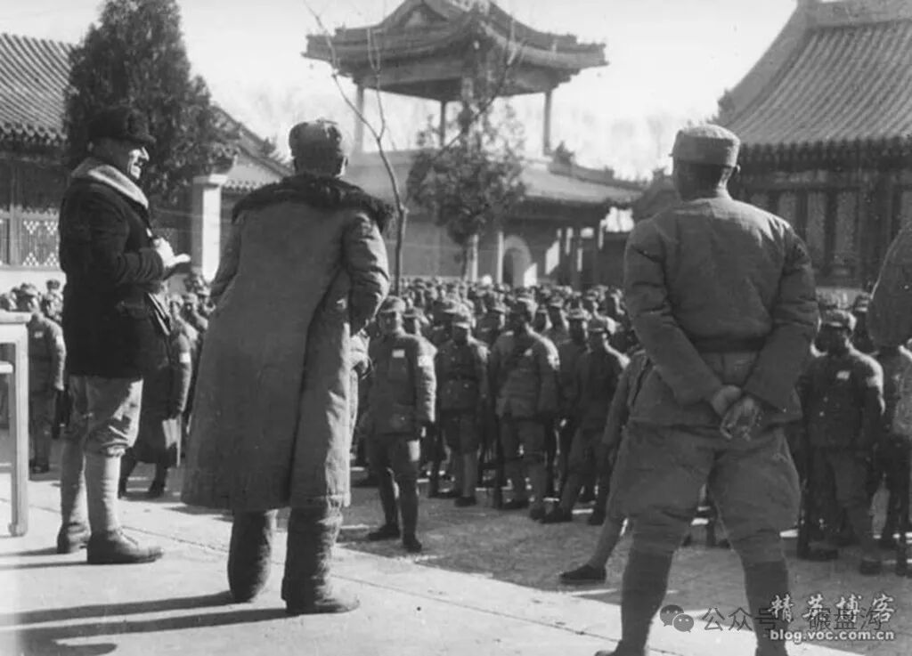 ▲美国驻华武官卡尔逊在阜平西庄村向八路军演讲,周立波(左)翻译。1938