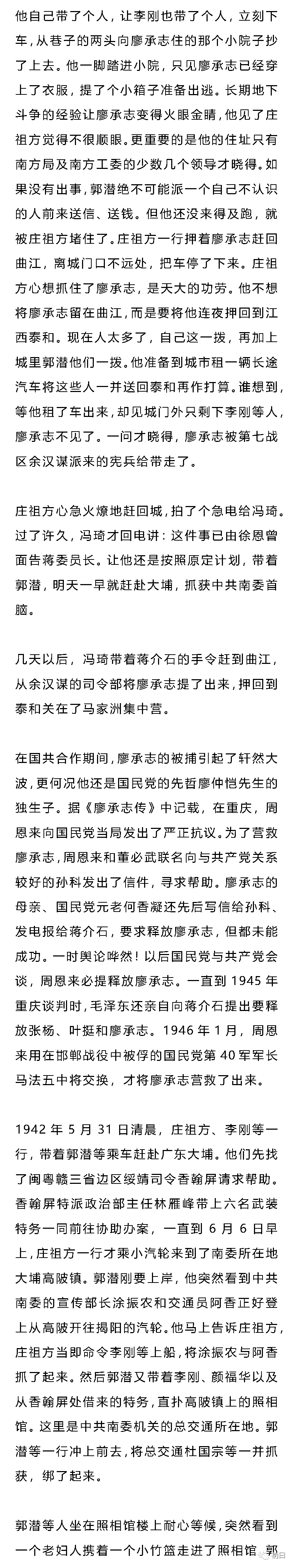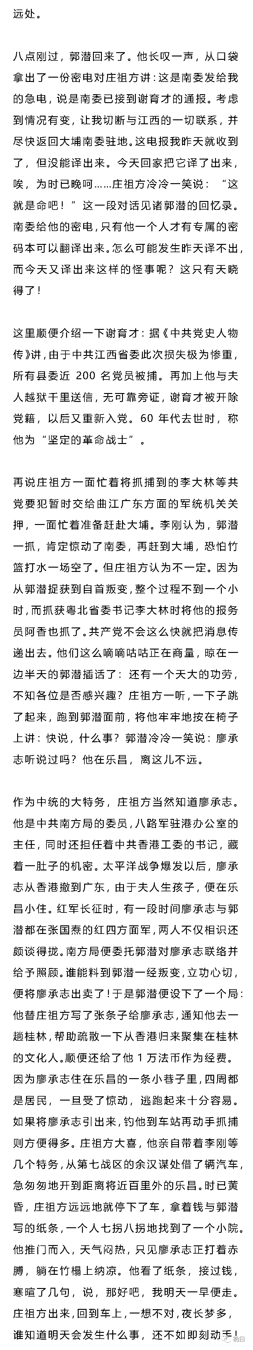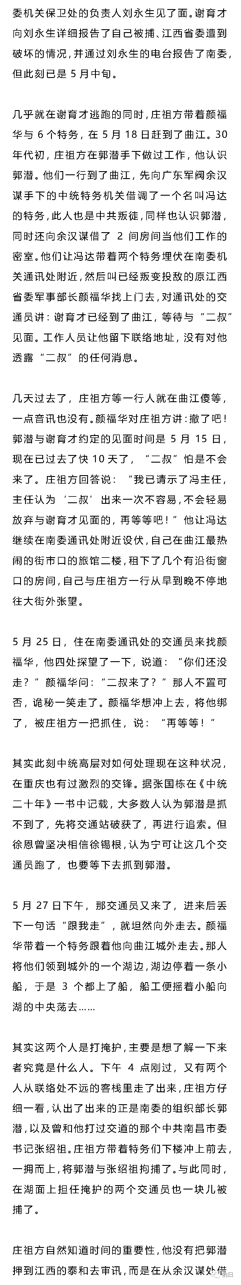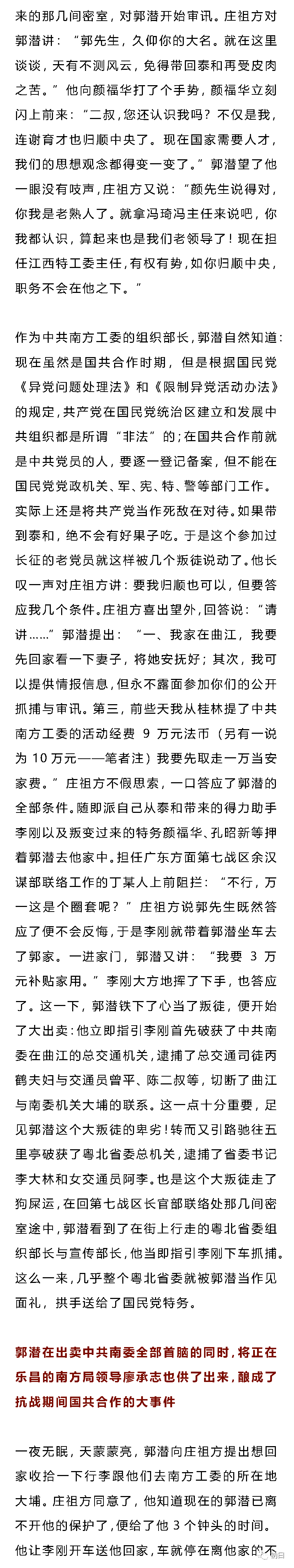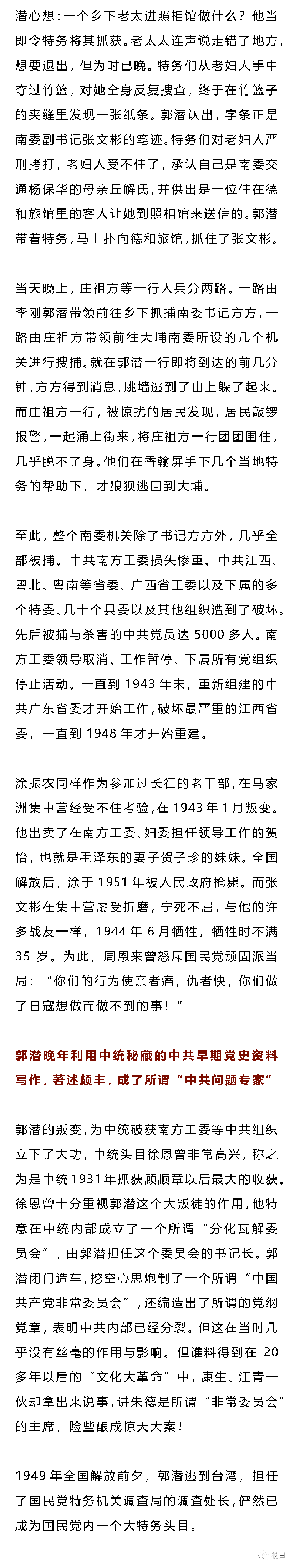熟悉中共党史的人都知道:上世纪30年代,原任中共中央保卫部门负责人的顾顺章是中共历史上危险最大、危害最烈的叛徒。可能大多数人都不知晓,在40年代初叶,中共还有一个叛徒叫郭潜。作为当时担任中共南方工委组织部长的郭潜,被捕叛变,指认出卖,造成了当时南方工委所领导的赣、闽、粤北、粤南、广西、潮海、琼崖、湘南等地的中共地下党组织的没顶之灾,大批领导干部被捕,大批党员与进步群众被枪杀,这些地区的各级党组织,几乎瘫痪。周恩来在向中央的一个报告中称:此次损失不亚于1941年发生的“皖南事变”。以致中共南方局被迫作出决定“南委(指南方工委——笔者注)领导取消,工作停止。”除沦陷区、敌占区外,“国民党统治区的党组织一律停止活动,党员实行隐蔽埋伏,上下级不发生组织关系,不发指示,不开会,支部也暂时不开会,不收党费……”一直到1944年以后(江西到1948年),各地党组织才陆续恢复活动。