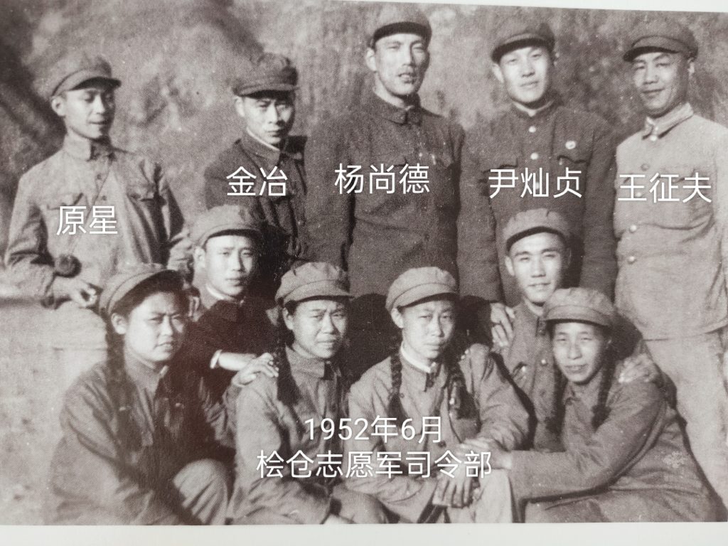 这张照片是各位首长1952年5月在志愿军司令部桧仓的合影,后排左1是第19兵团作战处长原星,左2是第9兵团作战处长金冶,左3是第20兵团作战处长杨尚德,左4是第40军作战科长尹灿贞,左5是第3兵团作战处长王征夫。前排是志愿军司令部的机要人员。