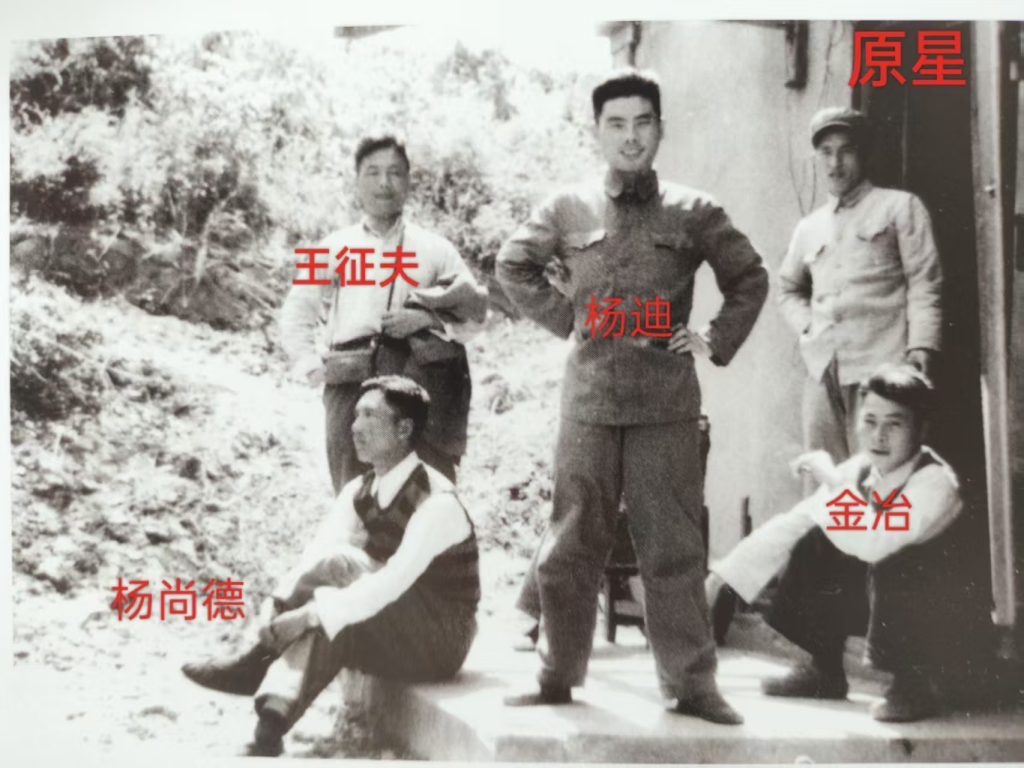 这张照片是1952年5月在朝鲜桧仓志愿军司令部,前排左边的是第20兵团作战处长杨尚德,中间的是志愿军司令部作战处副处长杨迪,前排右边的是第9兵团作战处长金冶。后排左边的是第3兵团作战处长王征夫,后排右边的是第19兵团作战处长原星。