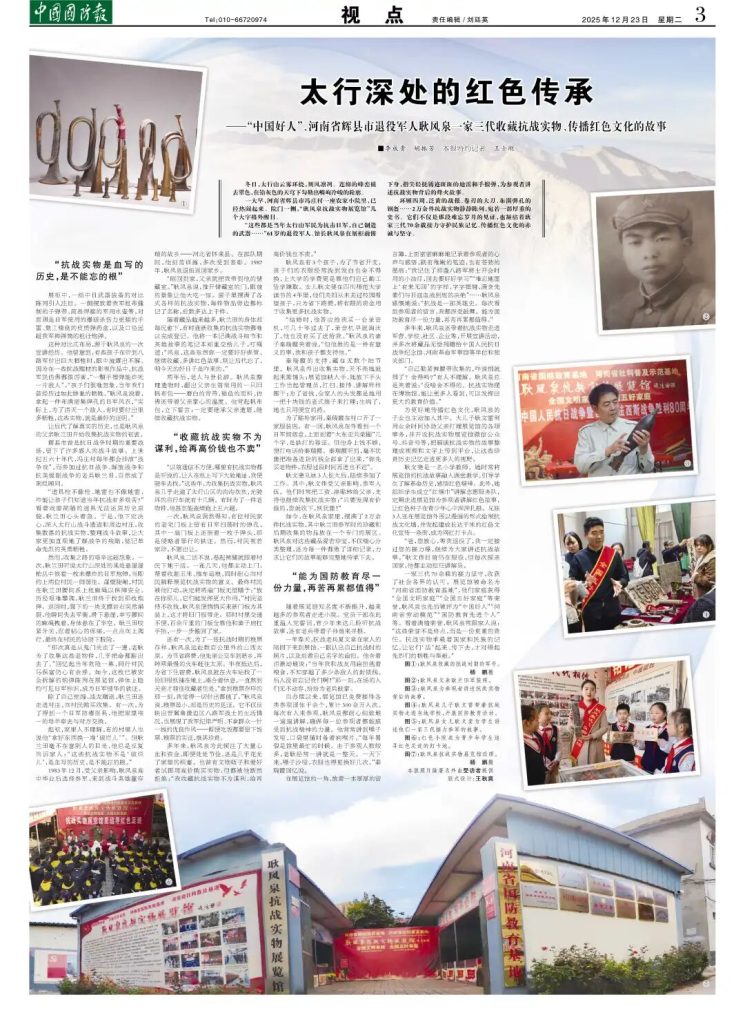 一家三代70余载的接力坚守,收获了社会各界的认可。展览馆被命名为“河南省国防教育基地”,他们家庭获得“全国文明家庭”“全国五好家庭”等荣誉,耿风泉也先后被评为“中国好人”“河南省劳动模范”“国防教育先进个人”等。看着满墙荣誉,耿风泉常跟家人说:“这些荣誉不是终点,而是一份更重的责任。抗战实物承载着国家和民族的记忆,让它们‘活’起来、传下去,才对得起先烈们的牺牲与奉献。”