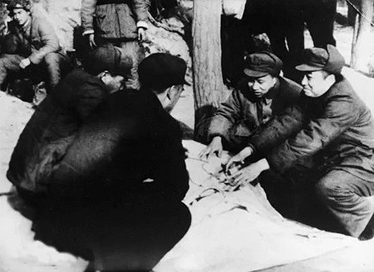 ◆1948年2月,瓦子街战役(即宜川战役)时,西北野战军指挥员在一起研究作战方案。右起:彭德怀司令员、甘泗淇副政委、赵寿山、张宗逊副司令员。