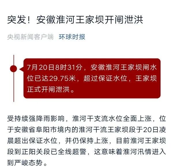 安徽阜阳王家坝地区多处汛情已泛滥成灾