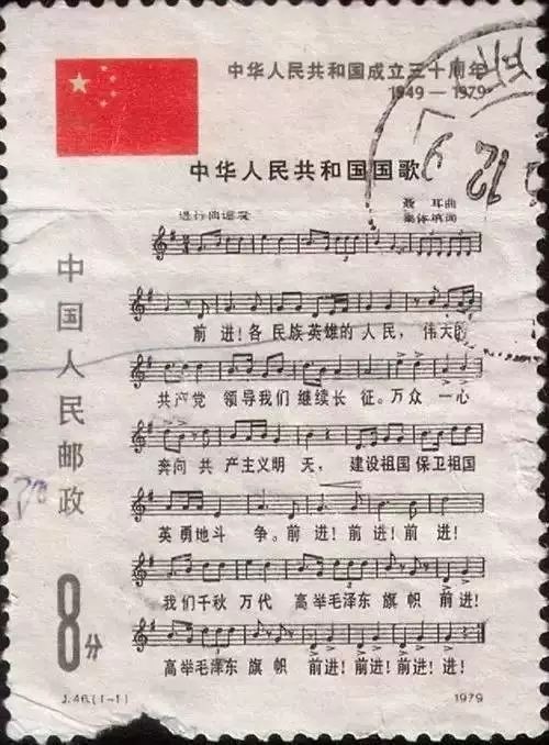 1979年的邮票,上面还是文革时改动过的国歌歌词,看上去似乎战斗已经结束,社会主义的明天一片光明。