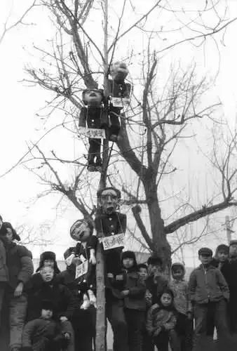 1977年1月在北京东长安街青年艺术剧院剧场前(位置在现东方广场正中)挂出的“四人帮玩偶”。