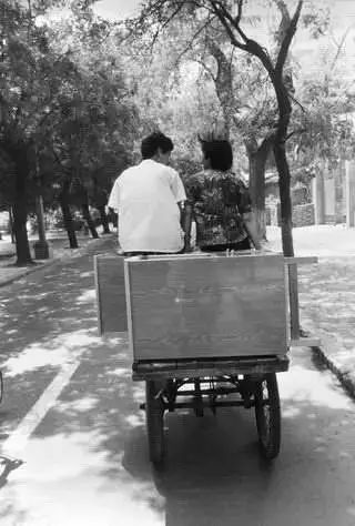 七十年代末八十年代初,年轻人结婚办理结婚证时,可以领取购买一件家具的票证,凭票证领号排一夜的队,就可以买到一件家具。这是一对新婚夫妇买到家具回家的情景。摄于1980年夏。