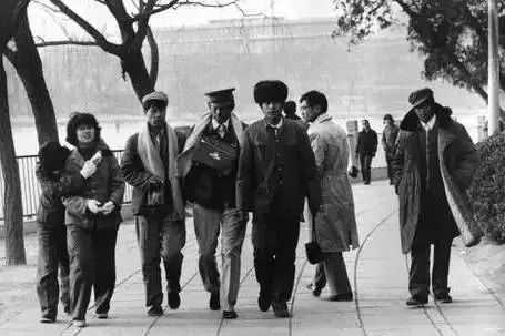 七十年代末八十年代初,羊剪绒帽子、大拉毛围巾、军大衣、进口蛤蟆镜一度是国内时尚青年的最爱。1980年3月摄于北海公园。