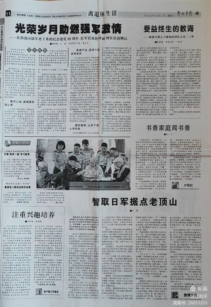纪念抗战胜利70周年时,我将父亲的原文《记老顶山战斗》发给了《解放军报》,2016年6月1日《解放军报》以《智取日军据点老顶山》为标题全文刊登。不久,智取老顶山的故事被广为流传,多家报刊杂志和网站以不同的标题刊登,例如《老顶山上的枪声》《江涛智取老顶山》等。最有趣的是我的一位在辽宁的战友告诉我:东北一家晚报刊登此文的标题是《送给日军的“铁元宵”》。