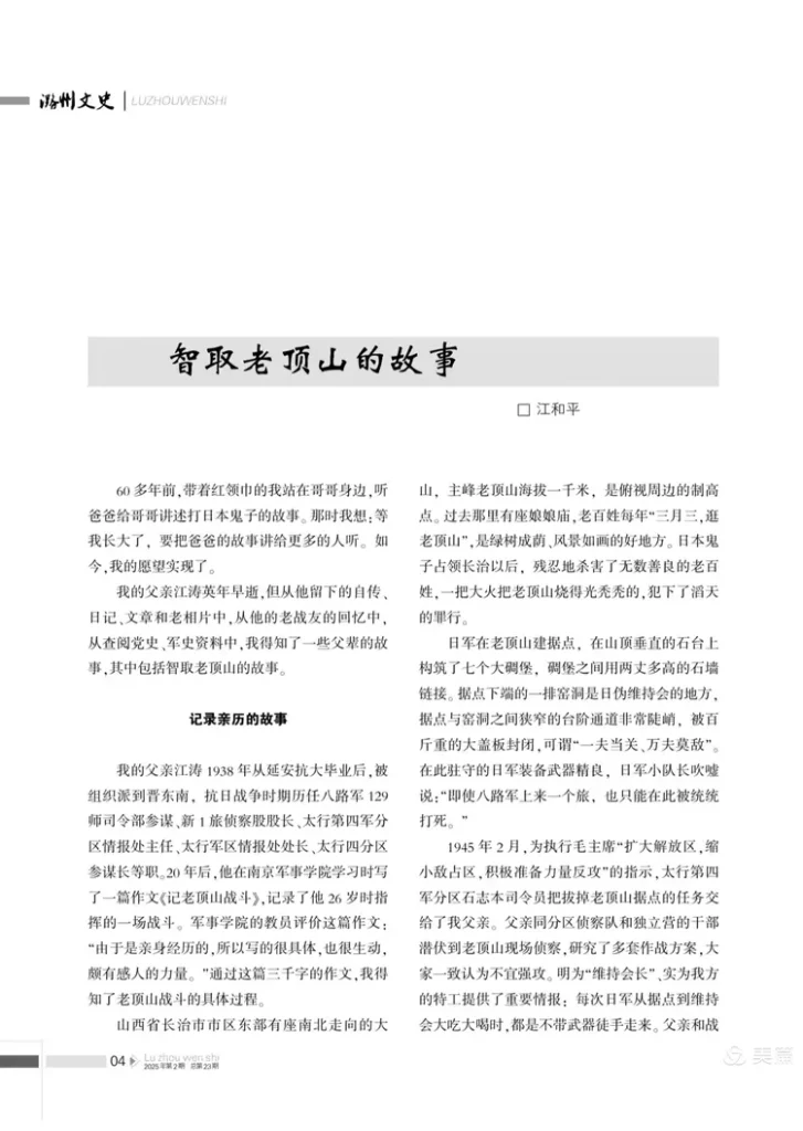 我的父亲江涛英年早逝,但从他留下的自传、日记、文章和老相片中,从他的老战友的回忆中,从查阅党史、军史资料中,我得知了一些父辈的故事,其中包括智取老顶山的故事。