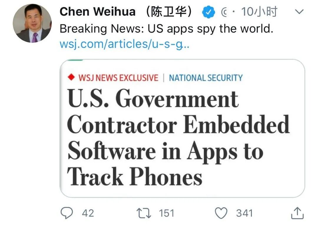 正如《中国日报》驻欧盟分社社长陈卫华在一条热评推文中写道的:美国APP监控着全世界。