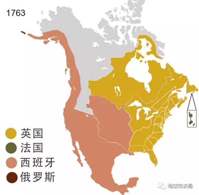 图上略有差误,法国仍保留在密西西比流域的一定影响力,但此地地广人稀,其实殖民者一直是点状的