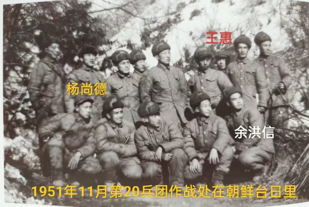 这张照片是第20兵团作战处于1951年11月在朝鲜第20兵团司令部驻地台日里的合影,后排左2是作战处长杨尚德,后排右3是我父亲王惠,前排右1是作战参谋余洪信。