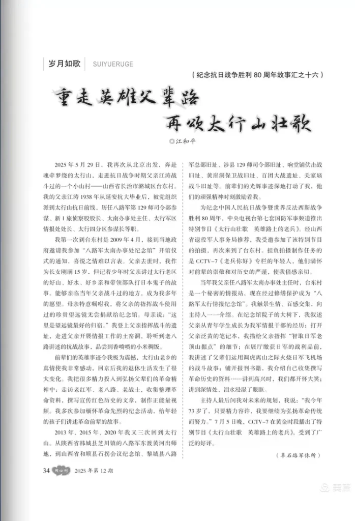 2025年5月29日,我再次从北京出发,来到魂牵梦绕的太行山,走进抗日战争时期父亲江涛战斗过的一个小山村——山西省长治市潞城区台东村。我的父亲江涛于1938年从延安抗大毕业后,被党组织派到太行山抗日前线,历任八路军129师司令部参谋、新1旅侦察股股长、太南办事处主任、太行军区情报处处长、太行四分区参谋长等职。