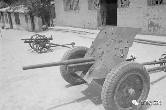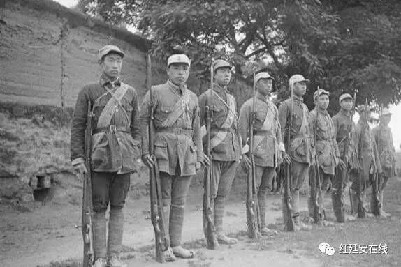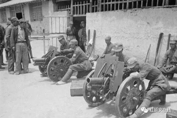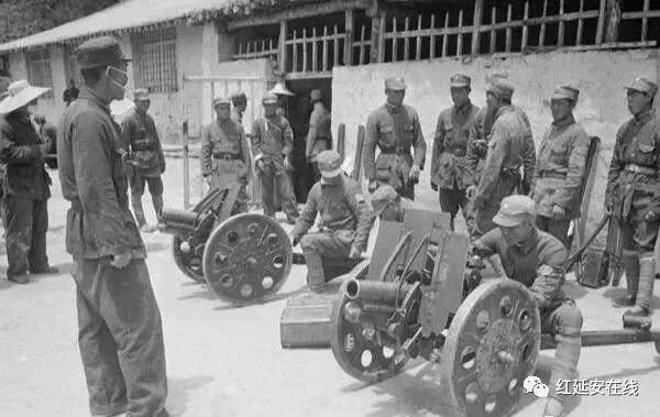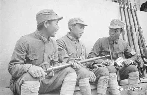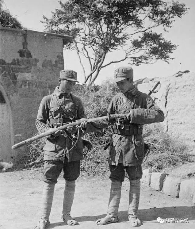 陕西省,八路军战士展示的武器装备。(南泥湾)1944年