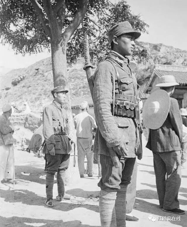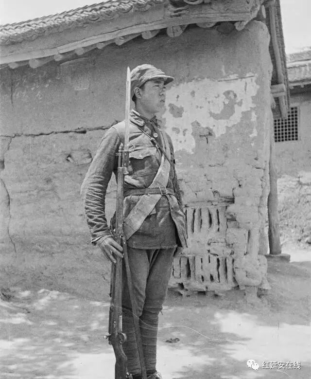 延安,站在悬崖窑洞民居外的八路军战士。1944年