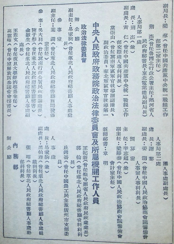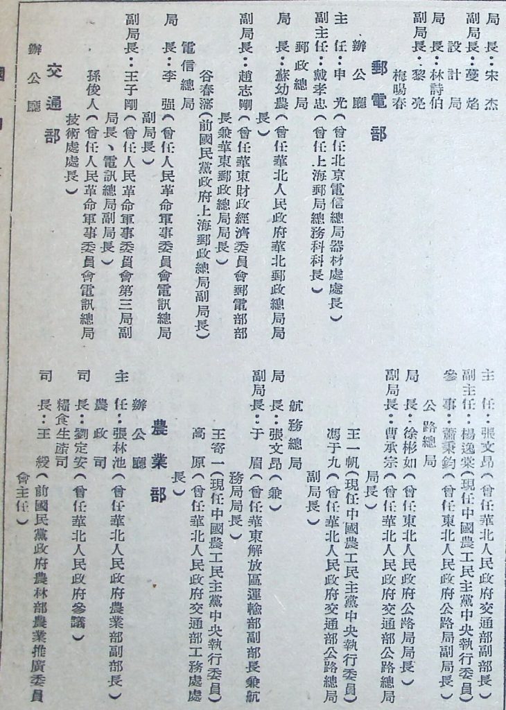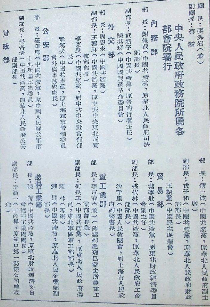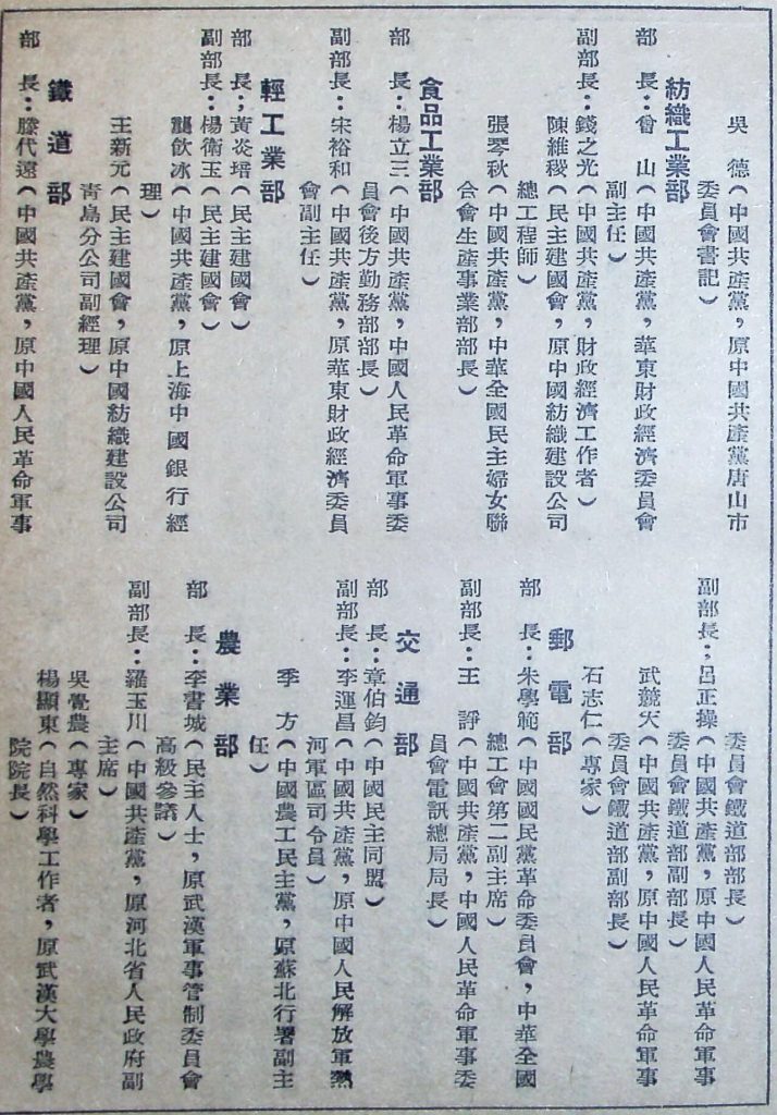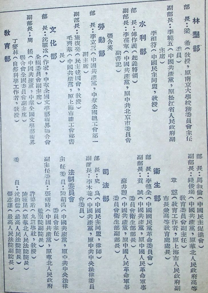 政务委员:谭平山(三民主义同志联合会)谢觉哉(中国共产党)罗瑞卿(中国共产党)薄一波(中国共产党)曾山(中国共产党)滕代远(中国共产党)章伯钧(中国民主同盟)李立三(中国共产党)马叙伦(中国民主促进会)陈劭先(中国国民党革命委员会)王昆仑(三民主义同志联合会)罗隆基(中国民主同盟)章乃器(民主建国会)邵力子(国民党民主派)黄绍竑(国民党民主派)李富春(现任东北人民政府副主席)