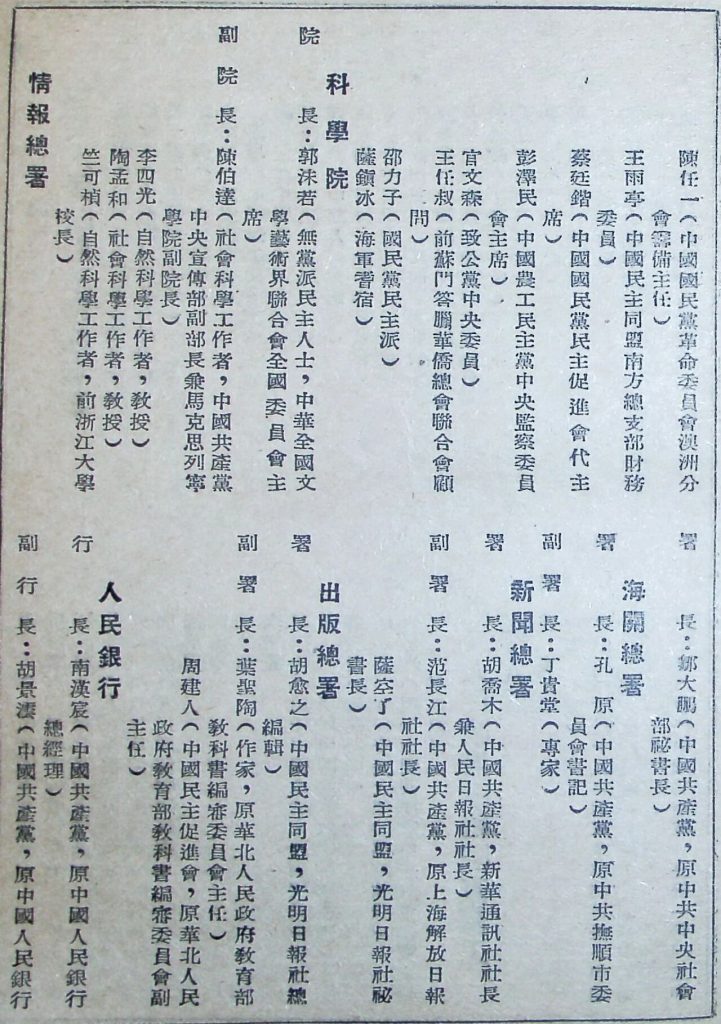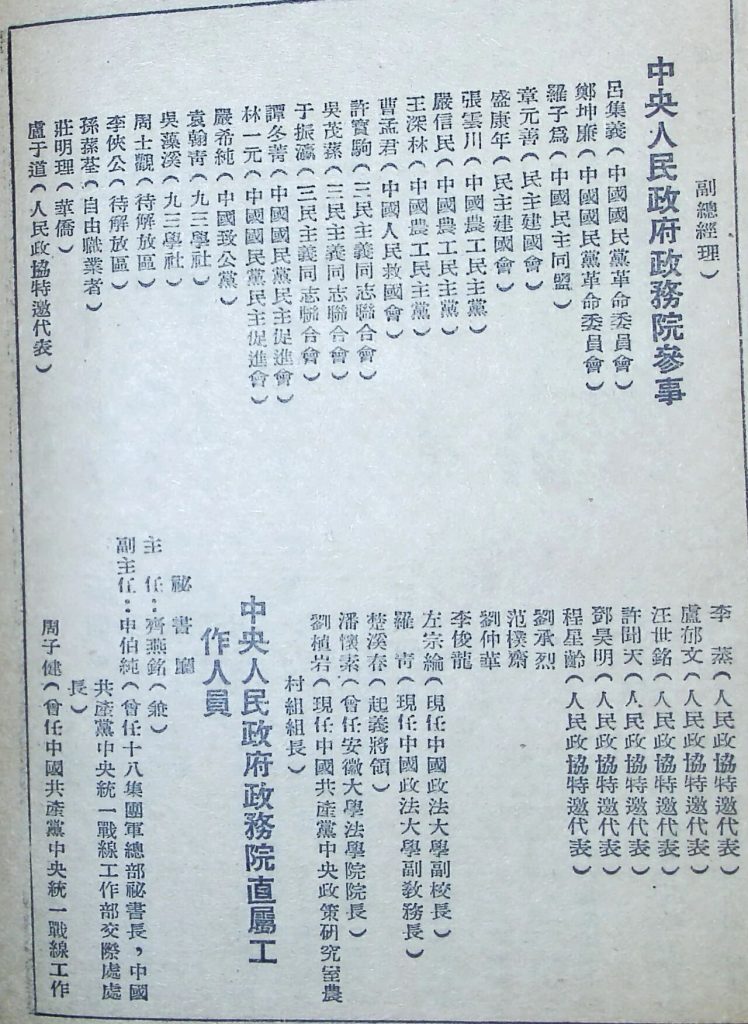 副总理:董必武(中国共产党)陈云(中国共产党)郭沫若(无党派民主人士)黄炎培(民主建国会)