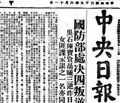 1950年6月10日,国民党台湾当局以“从事间谍活动”罪名判处吴石、朱枫(朱谌之)、陈宝仓、聂曦四人死刑。随后,台湾、香港的报纸对此事进行了报道。