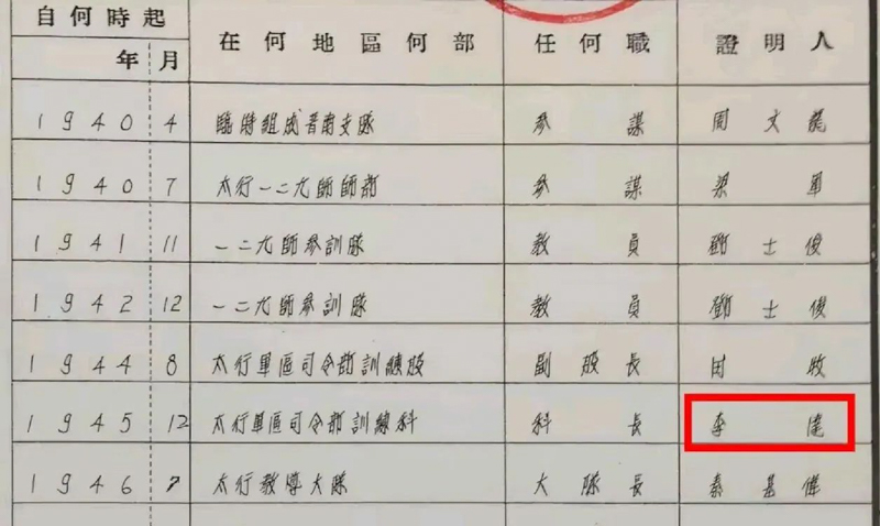 1945年12月,先父任太行军区训练科长。档案里记载的证明人是太行军区司令员李达。