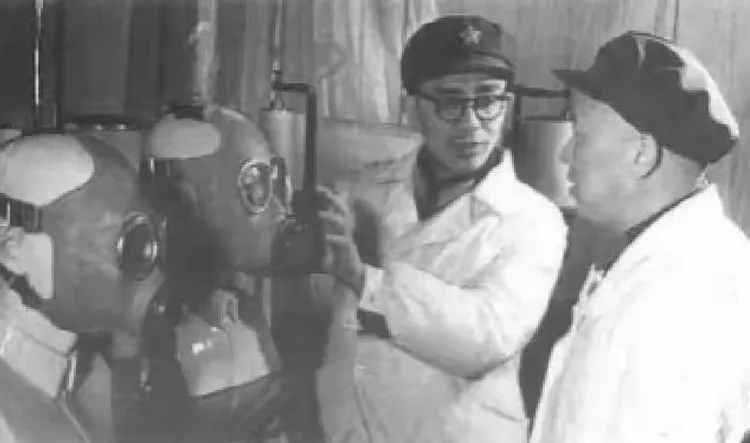 防化研究院专家高方(左)和李家骅在研制防毒面具