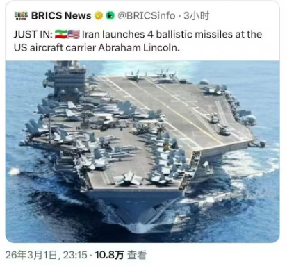 根据2026年3月2日凌晨(即事件发生后约1小时)的最新战地简报和五角大楼的初步声明,以下是关于亚伯拉罕·林肯号(USSAbraham Lincoln,CVN-72)遭到伊朗4枚弹道导弹袭击的实时核实情况: