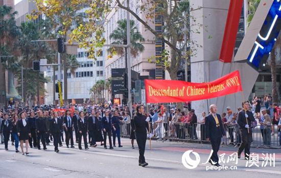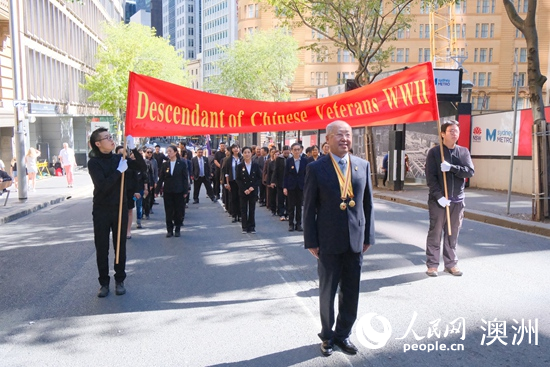 由中国抗日军人后代组成的方阵参加“澳新军团日”游行(摄影 刘涵琳)