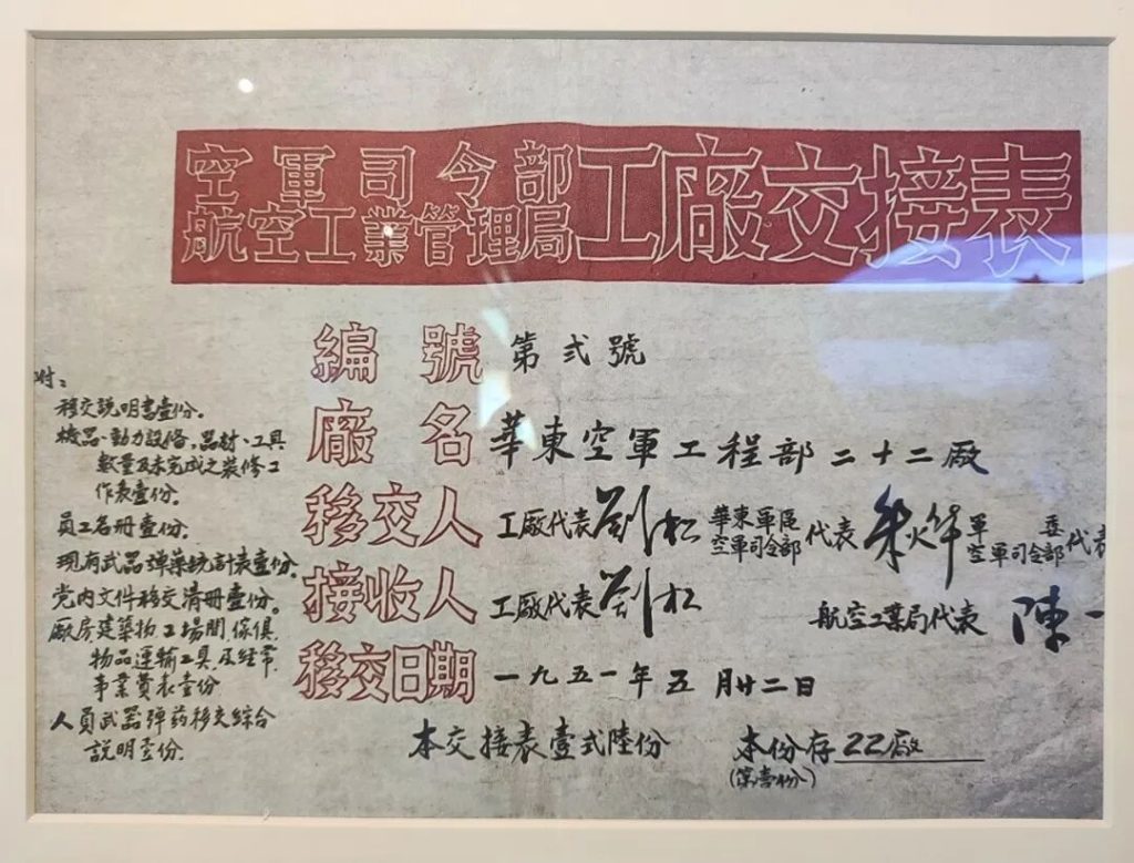 ▲空军司令部航空工业管理局工厂交接表(22厂为南京宏光机械厂前身)